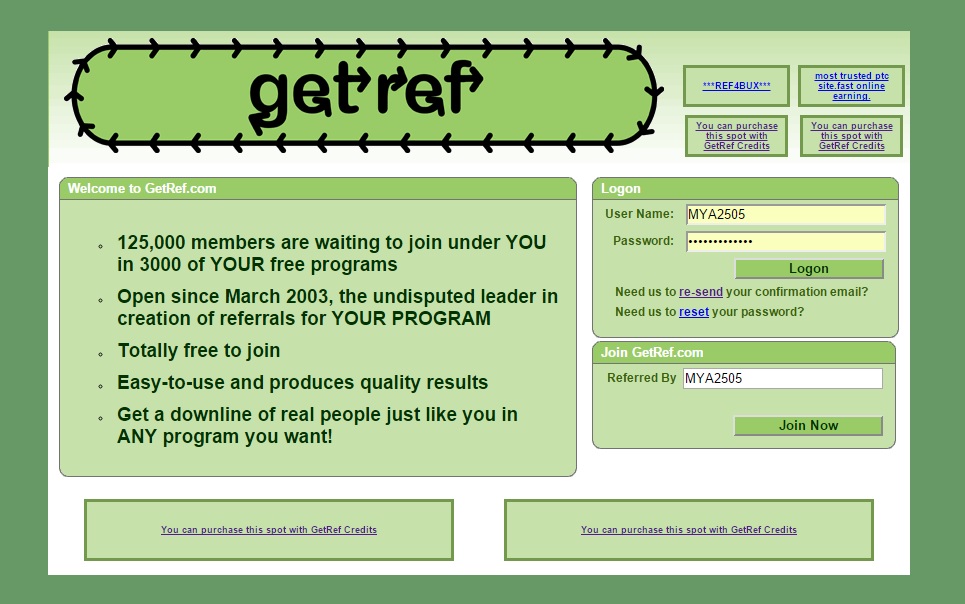 GetRef es un sitio que le ofrece muchas maneras de obtener referencias para sus programas de PTC( Adfly ). Actúa como un intermediario para que se ponga en contacto con posibles referencias y hacer ofertas con ellos para que se mantengan activos después de que se unan a su programa. Es muy difícil en estos días de obtener nuevas referencias para sus programas y en especial para Adfly, más la publicidad suele ser muy cara y la mayoría de las veces conduce a obtener referencias que se hacen inactivos después de un tiempo. Así que GetRef está aquí para ayudar a mejorar la calidad de sus referencias y para que le ayuden a ganar más con ellos.